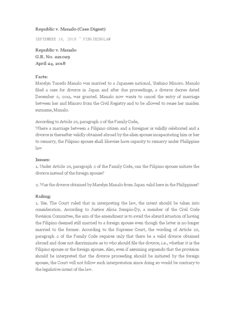 Rp vs manalo case digests. In 2000 the RP through Charge dAffaires Enrique A. MARELYN TANEDO MANALO RESPONDENT. Divorce decree initiated by filipino can be recognized by phil court brief title.