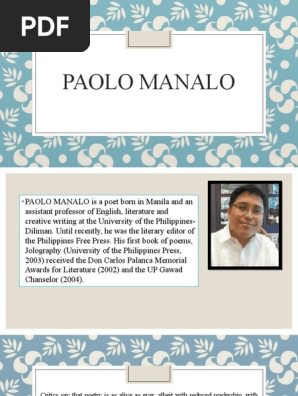 Dude man pare three people can be the same. PAOLO MANALO PAOLO MANALO is a poet born in Manila and an assistant professor of English literature and creative writing at the University of the Philippines- Diliman. For a time he served as the literary editor of the Philippines Free Press.