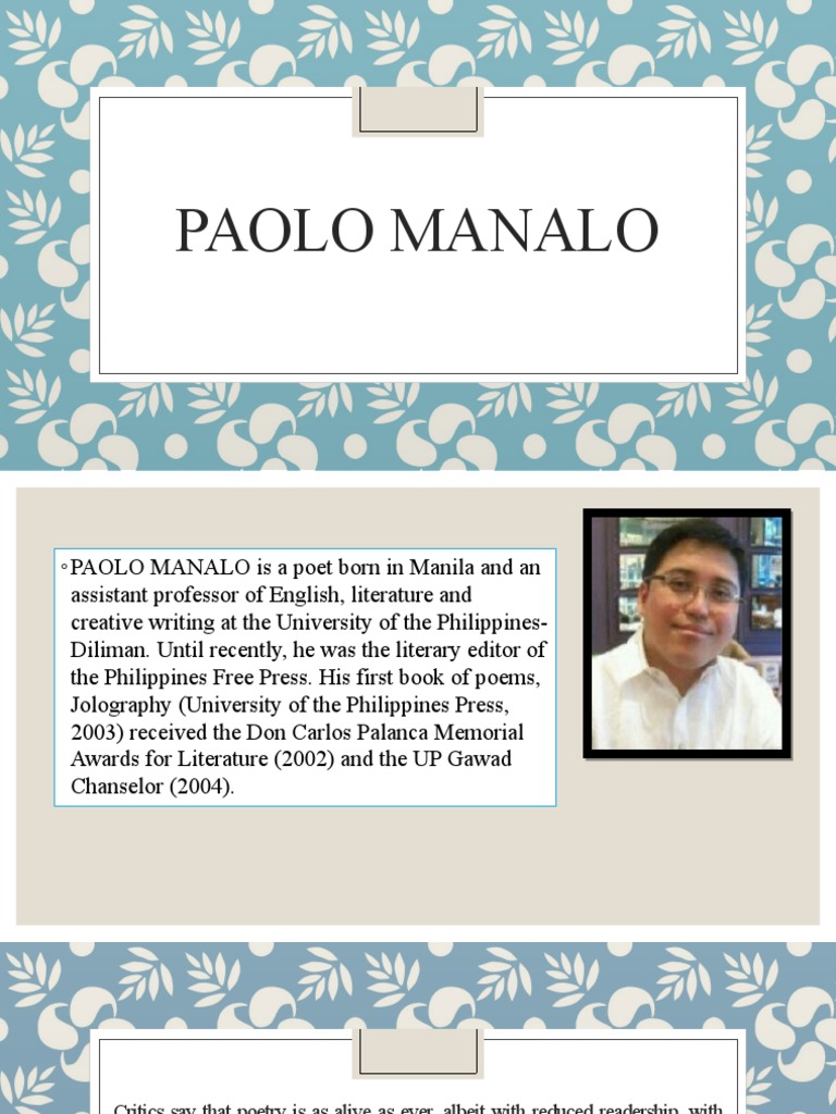 1 file s 24 mb Download Paolo Manalo Paolo Manalos first collection Jolography 2003 received recognition from the Don Carlos Palanca Memorial Awards for Literature and the UP Diliman Gawad Chancellor. If you would like more information about how to print save and work with PDFs Highwire Press provides a helpful Frequently Asked Questions about PDFs. Download and read books online.